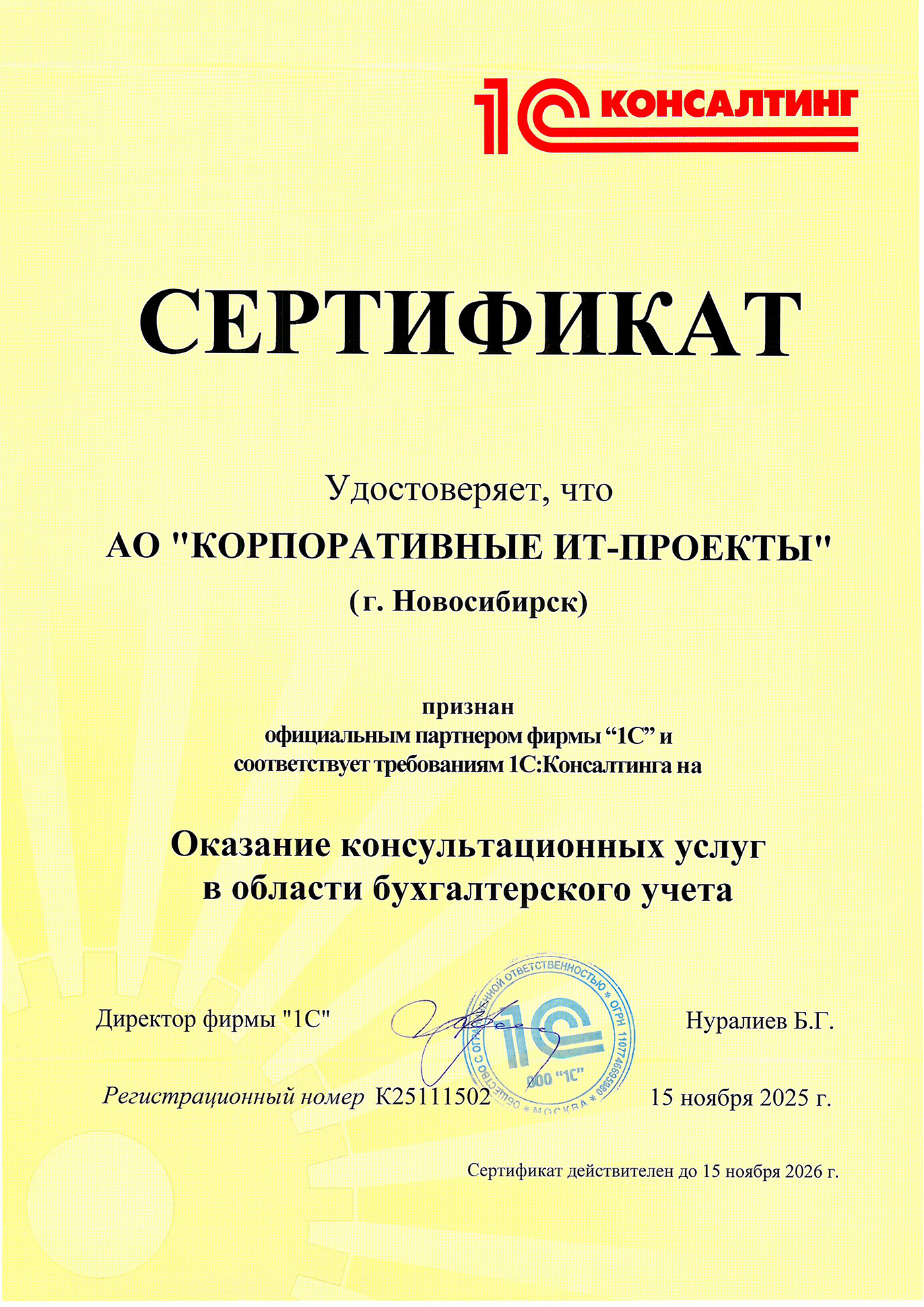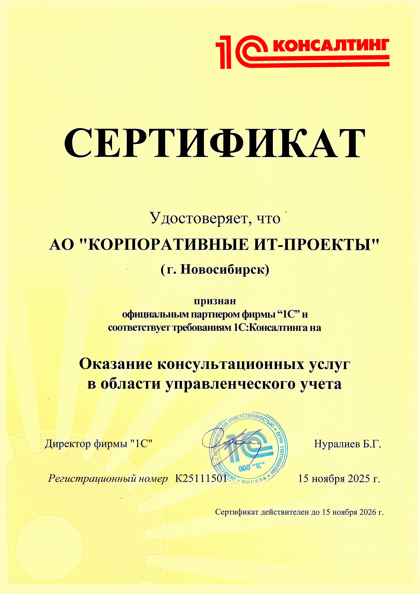 Сертификат удостоверяет, что АО "Корпоративные ИТ-Проекты" является официальным партнером фирмы "1С" и соответствует требованиям 1С:Консалтинга на оказание консультационных услуг в области управленческого учета.