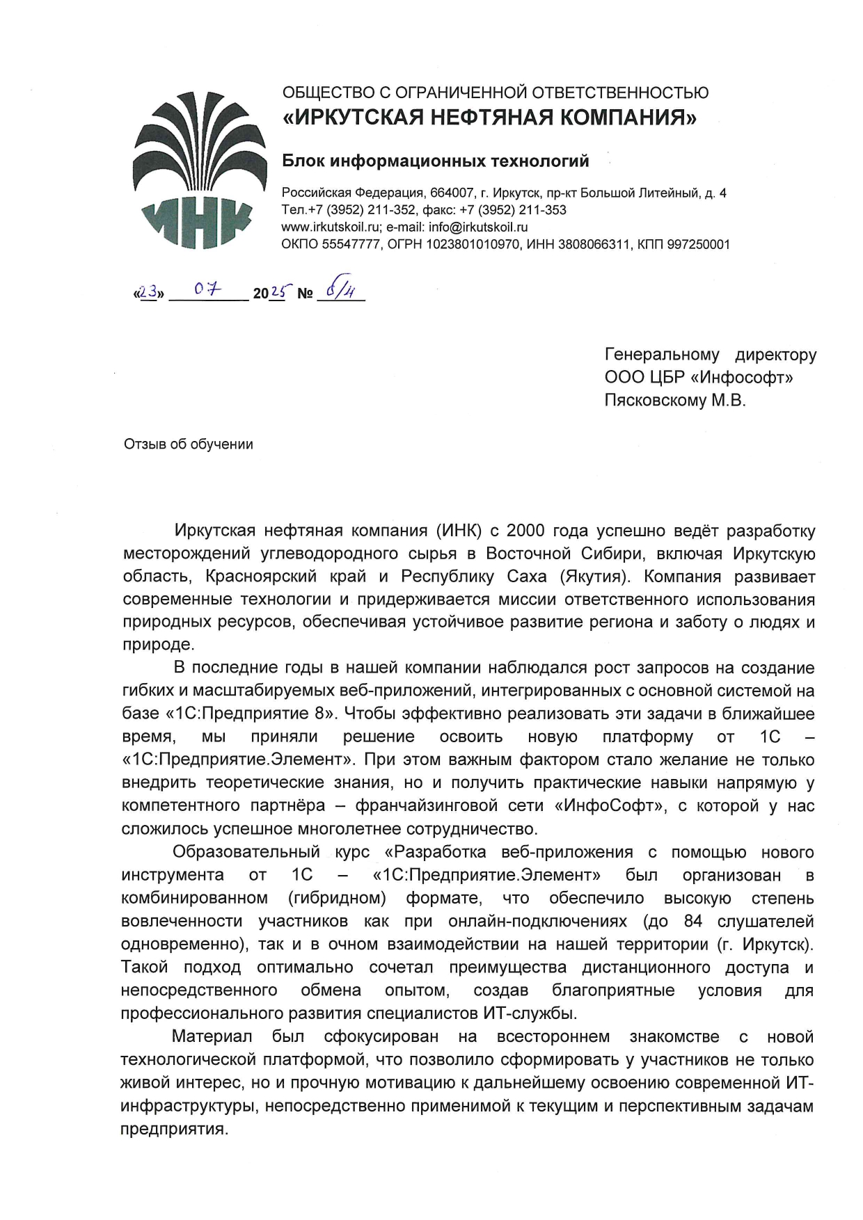 Отзыв ООО «ИНК» об обучении на курсе «Разработка веб-приложения на 1С:Предприятие.Элемент»