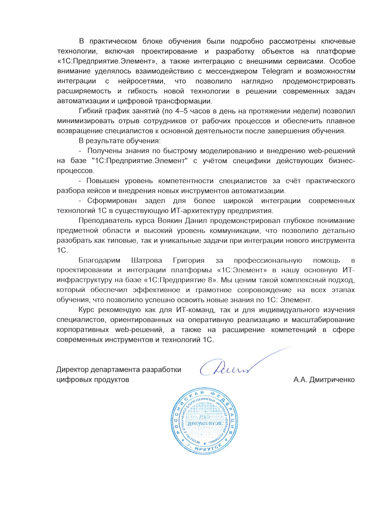 А также благодарим Шатрова Григория за профессиональную помощь в проектировании и интеграции платформы «1С:Элемент» в нашу основную ИТ-инфраструктуру на базе «1С:Предприятие 8». Мы ценим такой комплексный подход, который обеспечил эффективное и грамотное сопровождение на всех этапах обучения, что позволило успешно освоить новые знания по 1С: Элемент.