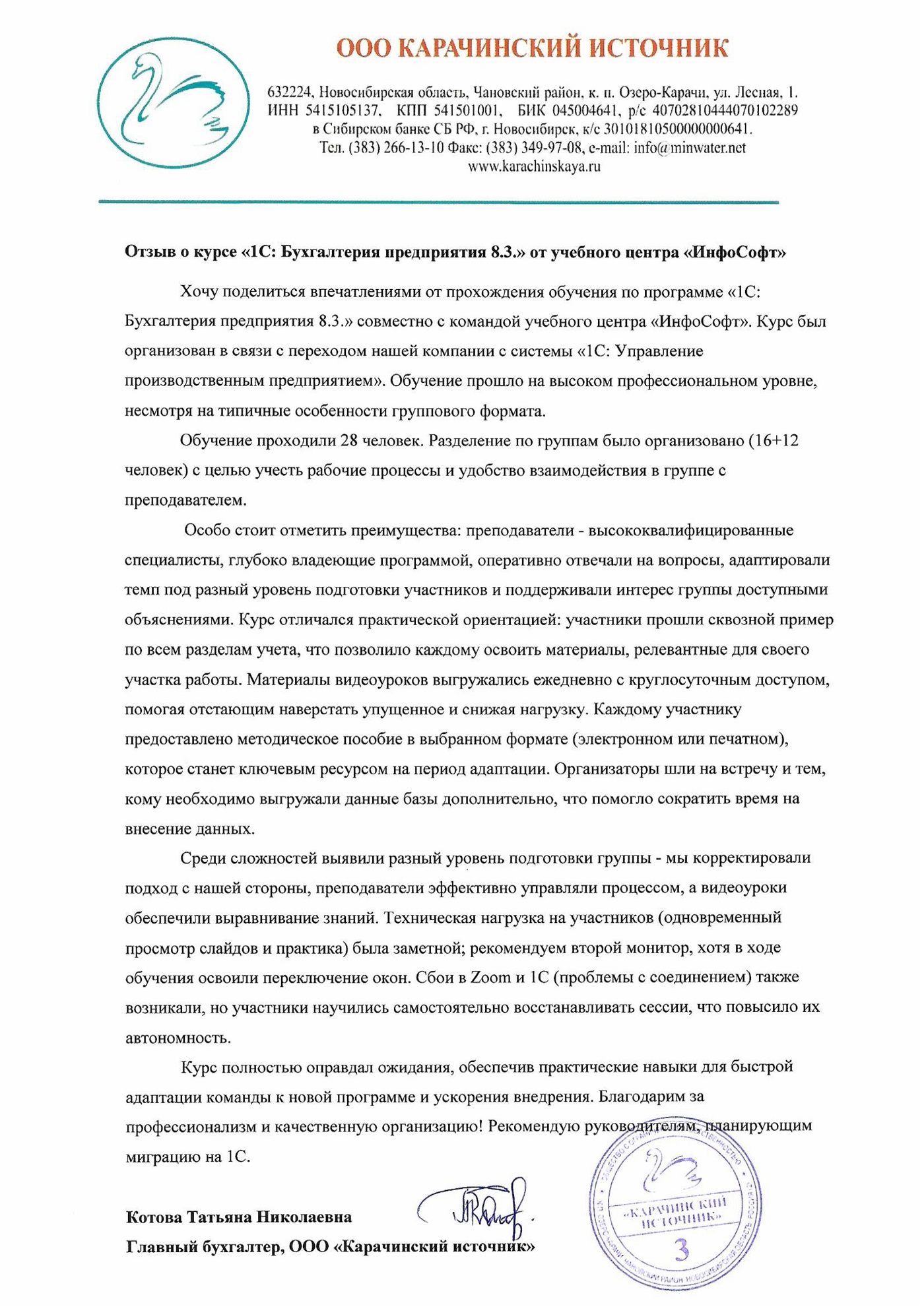 Отзыв ООО «Карачинский источник» о курсе 1С:Бухгалтерия предприятия 8.3