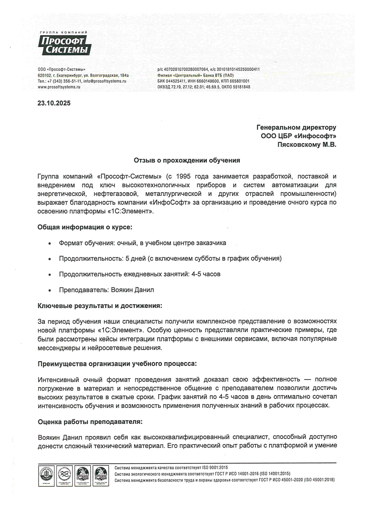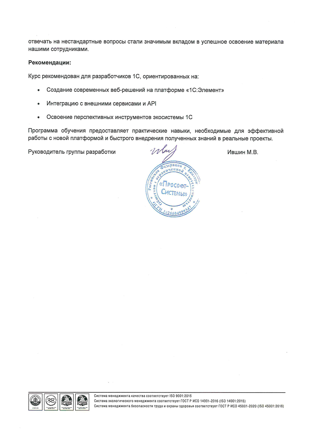 Отзыв ООО «Прософт-Системы» об обучении на курсе «Разработка веб-приложения на 1С:Предприятие.Элемент»