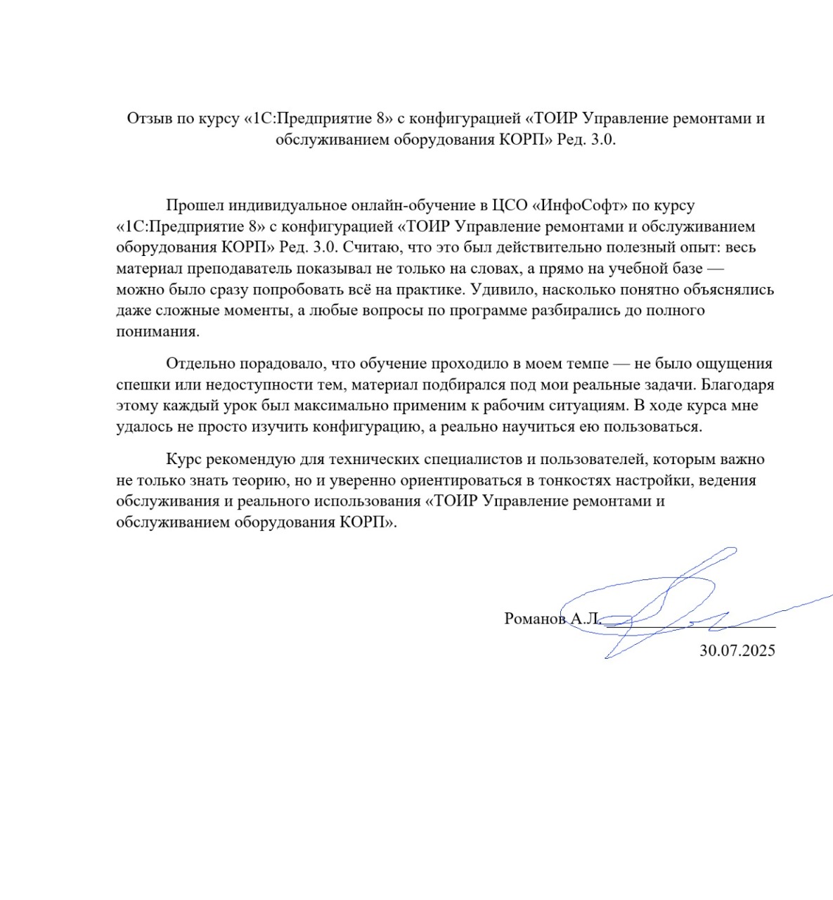 Прошел индивидуальное онлайн-обучение в ЦСО «ИнфоСофт» по курсу «1С:Предприятие 8» с конфигурацией «ТОИР Управление ремонтами и обслуживанием оборудования КОРП» Ред. 3.0. Считаю, что это был действительно полезный опыт: весь материал преподаватель показывал не только на словах, а прямо на учебной базе — можно было сразу попробовать всё на практике. Удивило, насколько понятно объяснялись даже сложные моменты, а любые вопросы по программе разбирались до полного понимания.