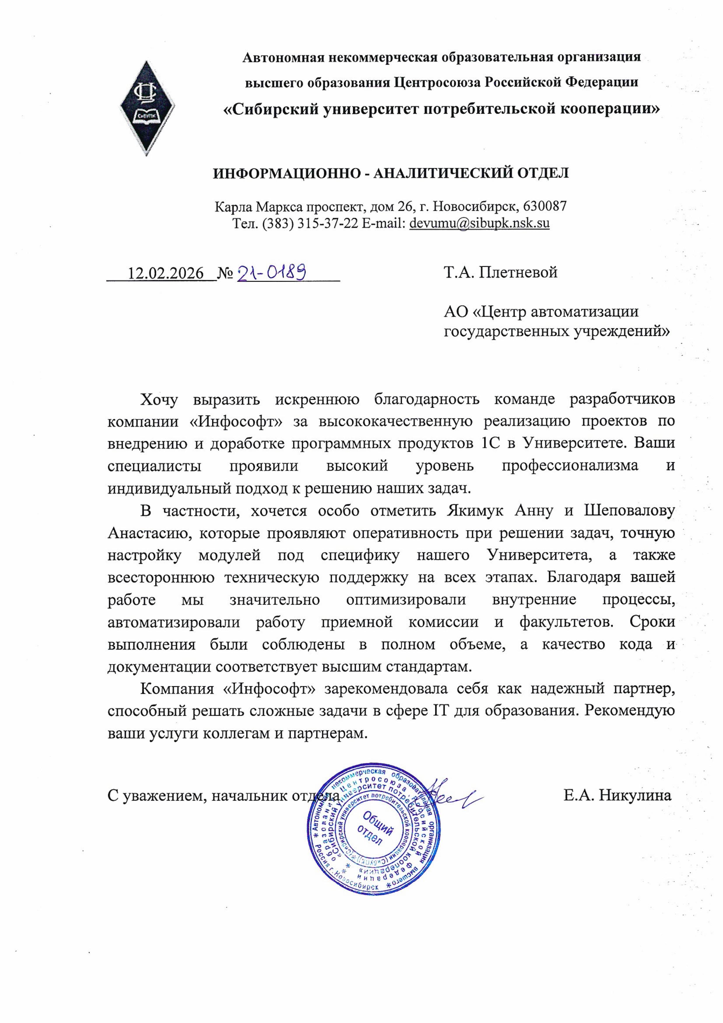 Хочу выразить искреннюю благодарность команде разработчиков компании «ИнфоCофт» за высококачественную реализацию проектов по внедрению и доработке программных продуктов 1С в Университете. Ваши специалисты проявили высокий уровень профессионализма и индивидуальный подход к решению наших задач.