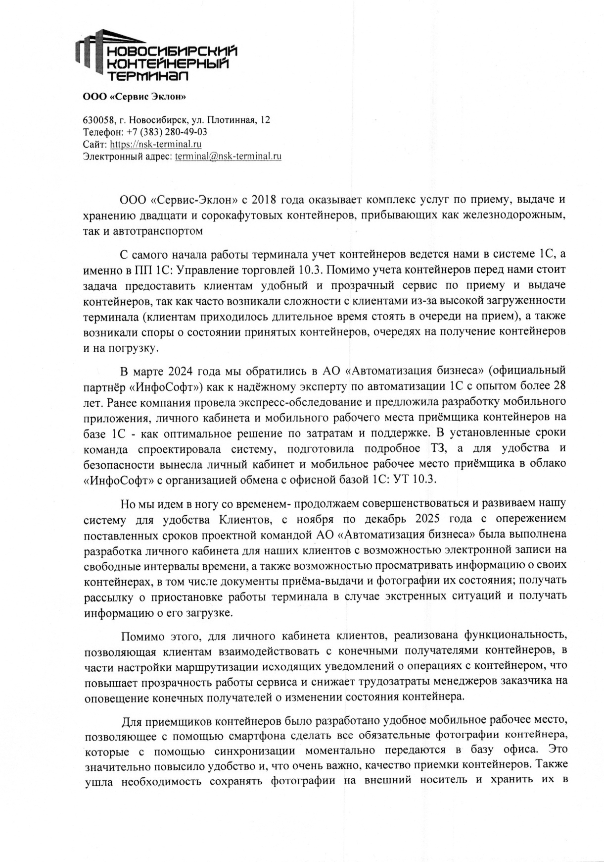 В марте 2024 года мы обратились в АО «Автоматизация бизнеса» (официальный партнёр «ИнфоСофт») как к надёжному эксперту по автоматизации 1С с опытом более 28 лет. Ранее компания провела экспресс-обследование и предложила разработку мобильного приложения, личного кабинета и мобильного рабочего места приёмщика контейнеров на базе 1С — как оптимальное решение по затратам и поддержке.