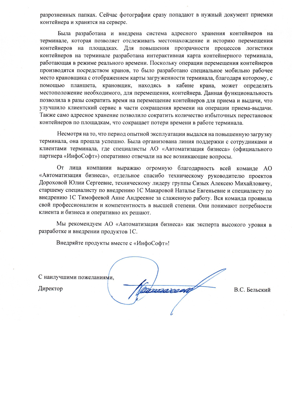 От лица компании выражаю огромную благодарность всей команде АО «Автоматизация бизнеса», отдельное спасибо техническому руководителю проектов Дороховой Юлии Сергеевне, техническому лидеру группы Сизых Алексею Михайловичу, старшему специалисту по внедрению 1С Макаровой Наталье Евгеньевне и специалисту по внедрению 1С Тимофеевой Анне Андреевне за слаженную работу. Вся команда проявила свой профессионализм и компетентность в высшей степени. Они понимают потребности клиента и бизнеса и оперативно их решают.