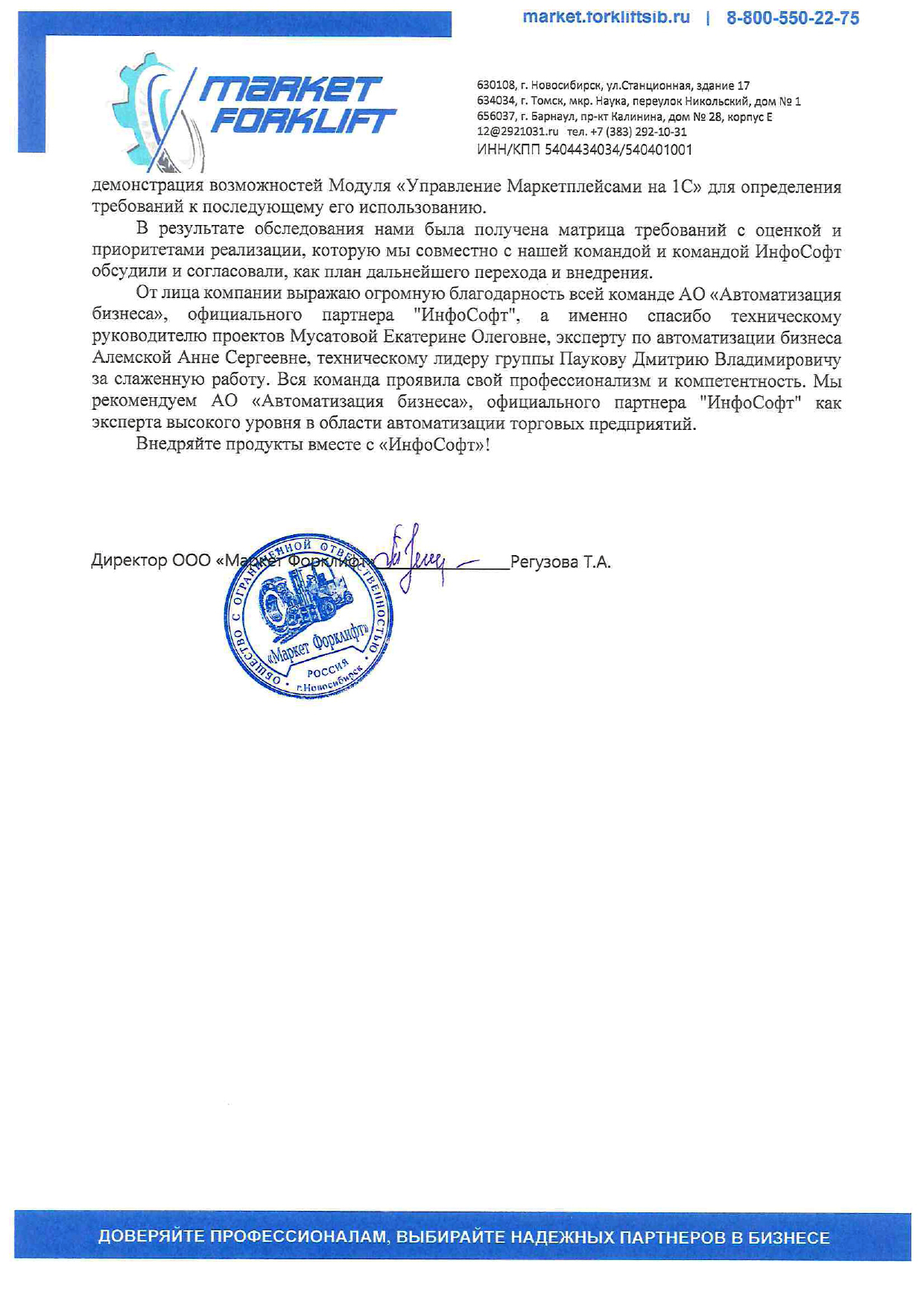 Компания «Маркет Форклифт» выражает огромную благодарность всей команде "ИнфоСофт" за слаженную работу. Вся команда проявила профессионализм и компетентность. Компания «Маркет Форклифт» рекомендует "ИнфоСофт" как эксперта высокого уровня в области автоматизации торговых предприятий.