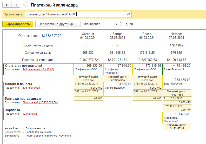 По прошествии определенного периода работы в установленной и настроенной конфигурации «1С:Бухгалтерия строительной организации», клиент обратился с просьбой доработать платежный календарь. Клиент активно пользуется отчетом, но заметил для себя нехватку данных в типовом решении. В нем есть колонка «Остаток денег на конец дня», но нет обобщенных сумм по поступлениям и списаниям за день. Помимо этого, в отчете нет информации об общем долге перед контрагентом и в разрезе договоров.