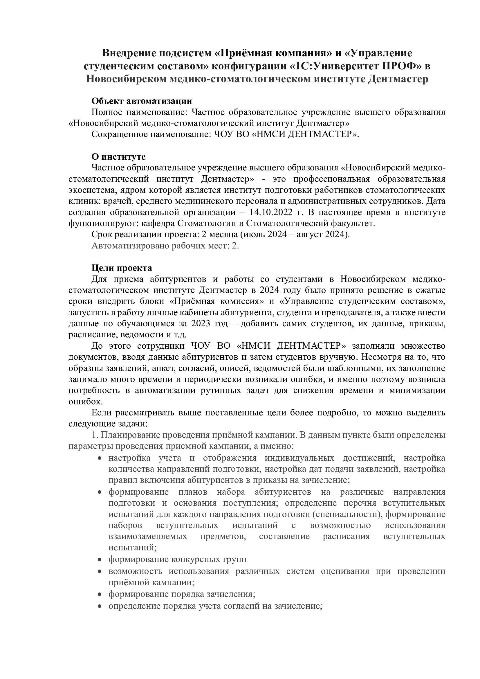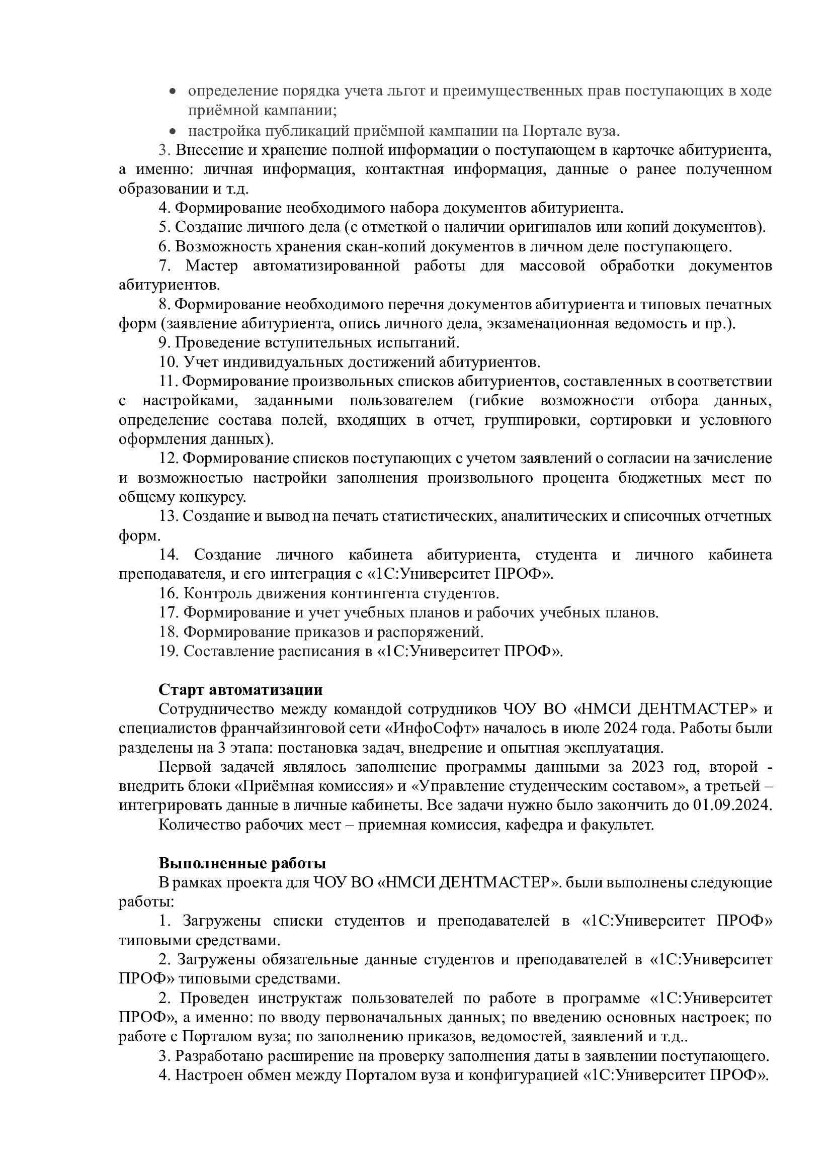 Сотрудничество между командой сотрудников ЧОУ ВО «НМСИ ДЕНТМАСТЕР» и специалистов франчайзинговой сети «ИнфоСофт» началось в июле 2024 года. Работы были разделены на 3 этапа: постановка задач, внедрение и опытная эксплуатация.