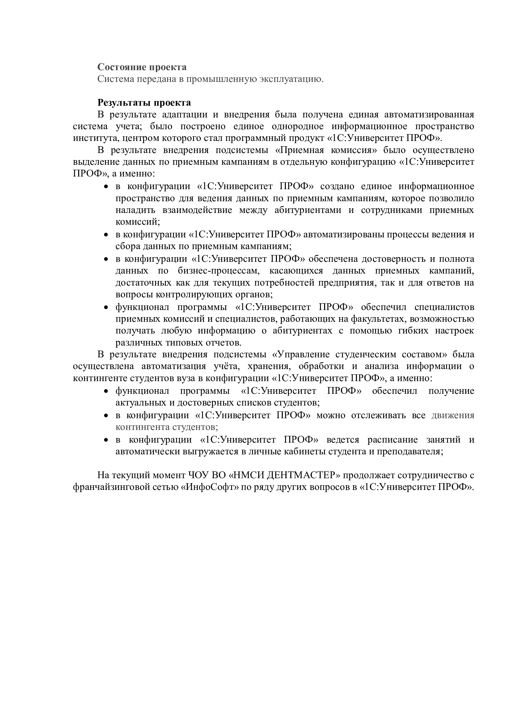 На текущий момент ЧОУ ВО «НМСИ ДЕНТМАСТЕР» продолжает сотрудничество с франчайзинговой сетью «ИнфоСофт» по ряду других вопросов в «1С:Университет ПРОФ».
