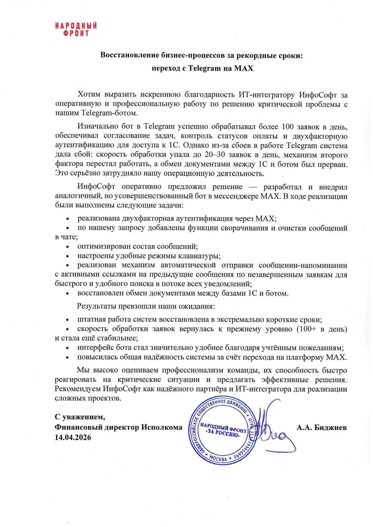 Хотим выразить искреннюю благодарность ИТ-интегратору ИнфоСофт за оперативную и профессиональную работу по решению критической проблемы с нашим Telegram-ботом.