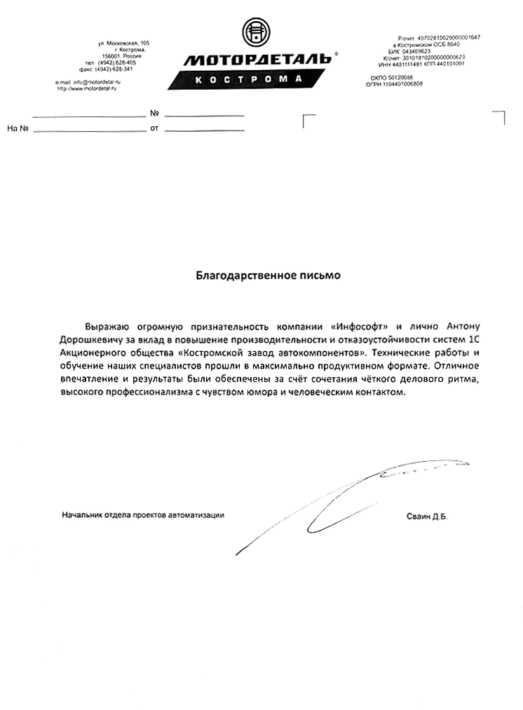 Выражаю огромную благодарность компании «ИнфоСофт» и лично Антону Дорошкевичу за вклад в повышение производительности и отказоустойчивости систем 1С Акционерного общества «Костромской завод автокомпонентов».