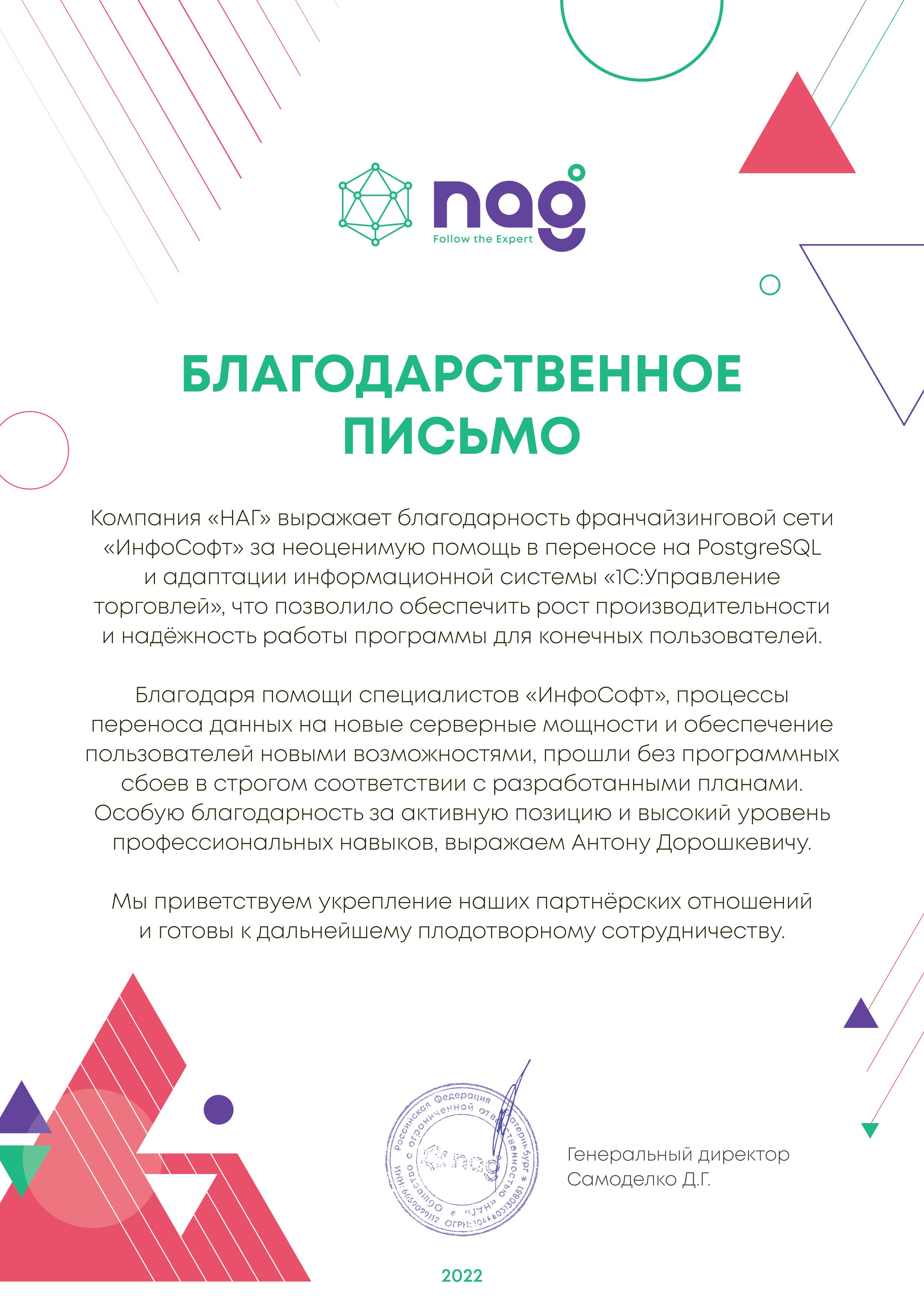 Компания «НАГ» выражает благодарность франчайзинговой сети «ИнфоСофт» за неоценимую помощь в переносе на PostgreSQL и адаптации информационной системы "1С:Управление торговлей", что позволило обеспечить рост производительности и надежность работы программы для конечных пользователей.
