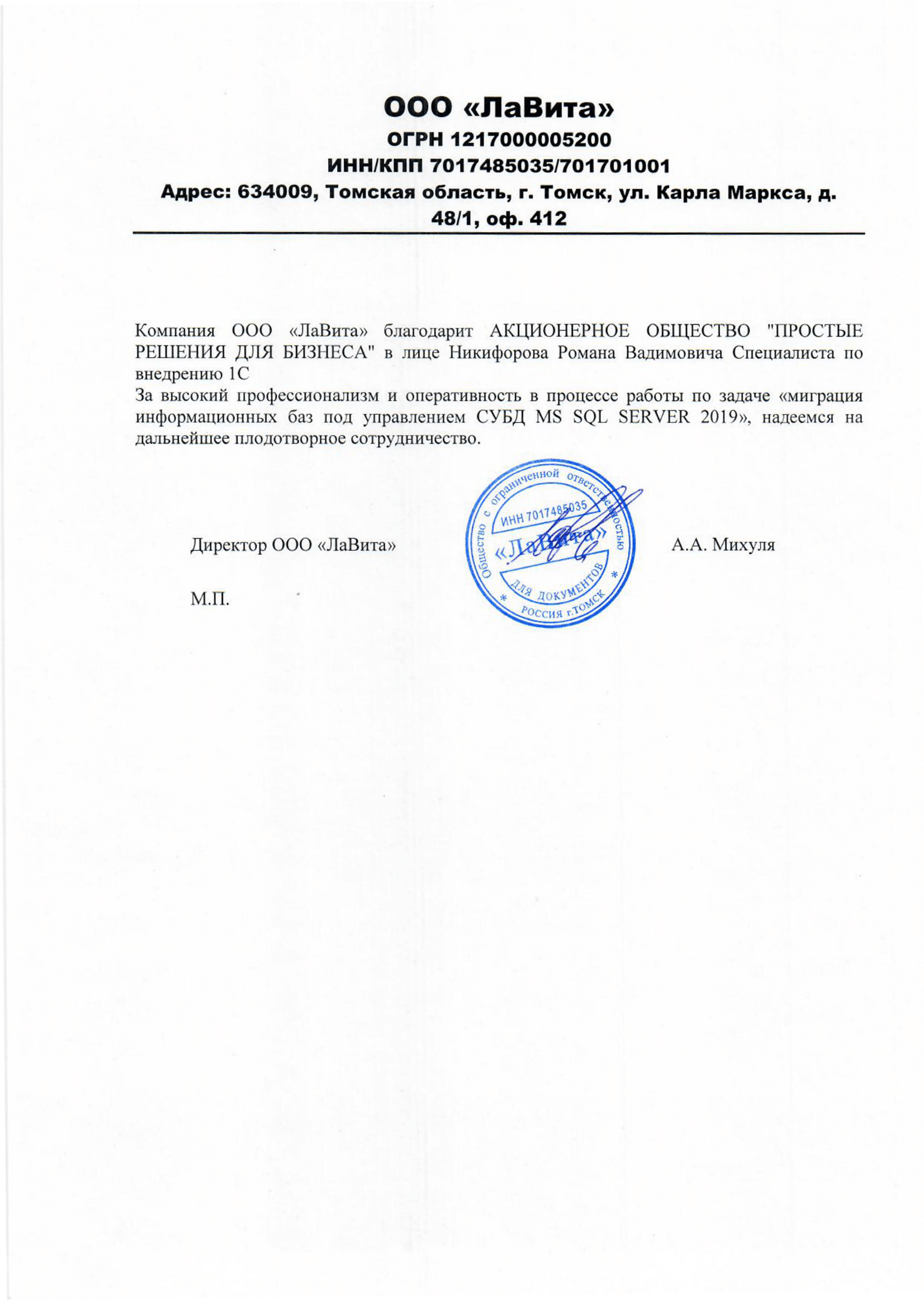 Компания ООО «ЛаВита» благодарит Акционерное общество «Простые решения для бизнеса» в лице Никифорова Романа Вадимовича, специалиста по внедрению 1С.